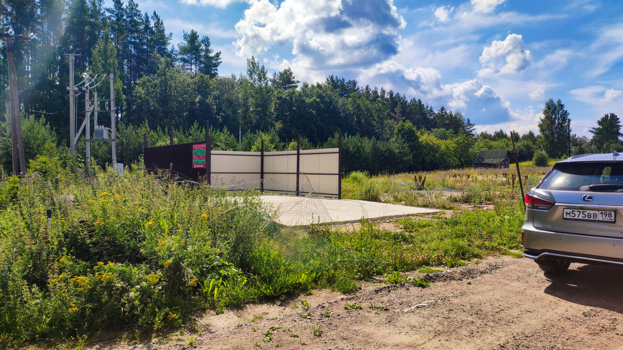 На фотографии показана площадка с бетонным основанием и ограждением из профнастила, предназначенная для установки контейнеров для отходов. Вблизи расположен автомобиль, на фоне видны лесной массив, электроподстанция и деревянные постройки. В кадре присутствует высокая трава и дикие растения, что подчёркивает пригородный или сельский характер местности. Снимок подходит для использования в публикациях о благоустройстве, экологии и управлении отходами.