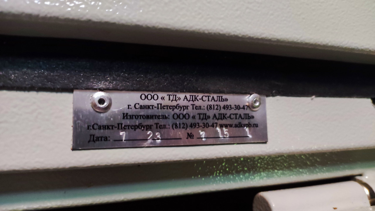 На изображении показана металлическая табличка на оборудовании с надписью ООО «ТД» АДК-СТАЛЬ, расположенном в Санкт-Петербурге. На табличке указан телефон, адрес сайта и дата изготовления, что подтверждает заводское происхождение конструкции. Табличка закреплена на светлой поверхности с помощью винтов. Подобные фото можно использовать в материалах о промышленности, производителях строительных материалов и идентификации оборудования.