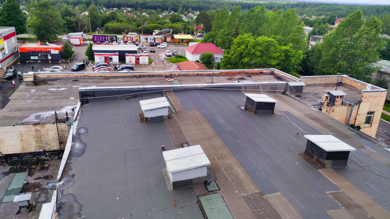 На фотографии изображена плоская крыша административного здания, покрытая рулонным материалом и оборудованная вентиляционными шахтами. На заднем плане видна парковка с автомобилями и торговые павильоны, выполненные в ярких цветах. Справа в кадре заметна кирпичная постройка с инженерными коммуникациями. Вдали можно увидеть жилой район и густую зелень деревьев. Небо затянуто серыми облаками, характерными для дождливой погоды. Снимок иллюстрирует сочетание торговой и жилой инфраструктуры на окраине города.