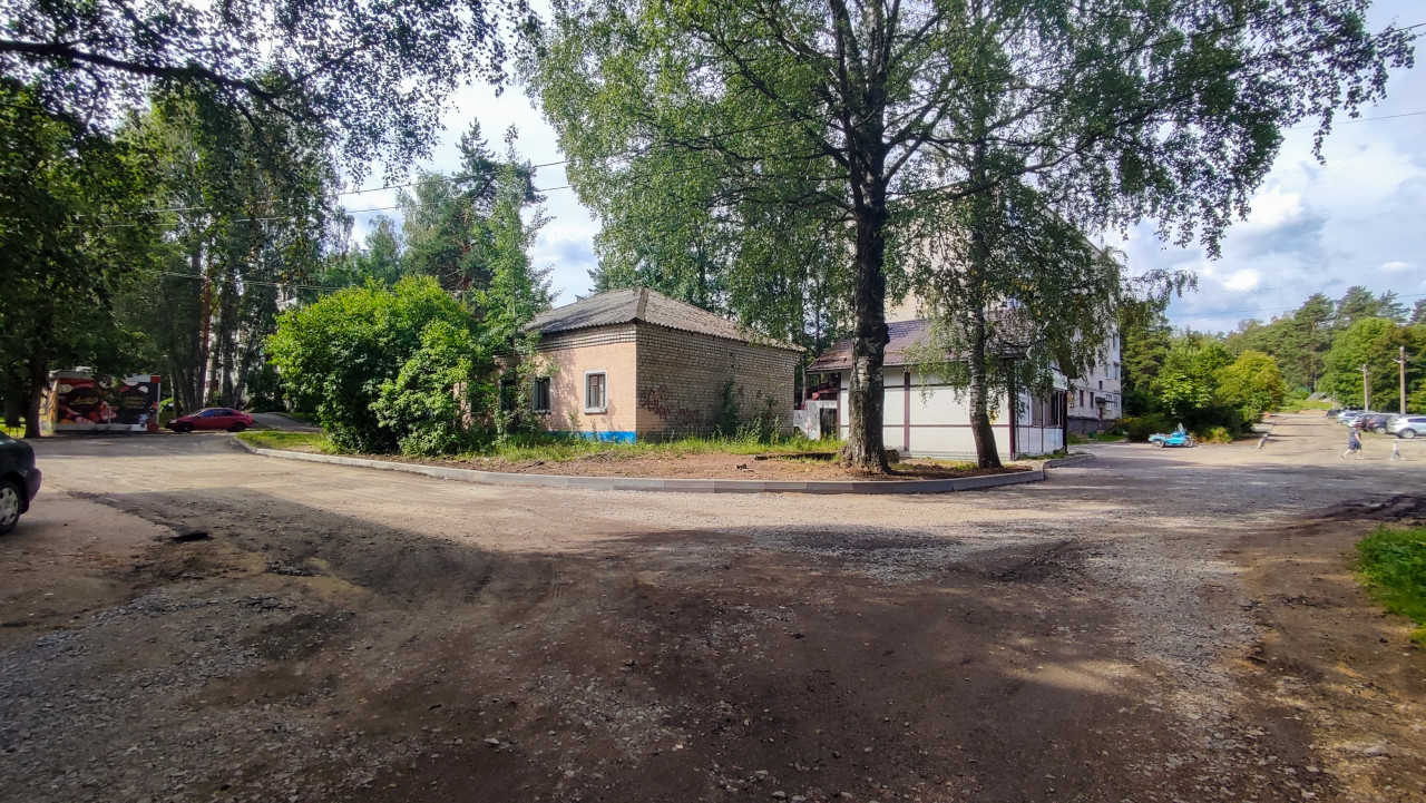 На снимке изображен перекресток внутридворовых дорог, засыпанных гравием и частично подготовленных к асфальтированию. В центре кадра стоит кирпичное одноэтажное здание хозяйственного назначения с шиферной крышей. Вокруг растут деревья, а на заднем плане видны многоэтажные жилые дома. Сцена отражает благоустройство района и может быть использована для иллюстраций строительства и городской среды.