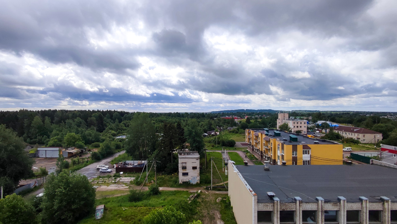 Фотография сделана с высоты и показывает окраину города, где сочетаются жилые дома, хозяйственные постройки и зелёные массивы. В кадре выделяются новые жёлтые дома современного типа и старые промышленные здания. На горизонте — лесной массив, который окружает город. Дороги и автомобили указывают на транспортную активность. Небо затянуто плотными облаками, создающими атмосферу дождливого дня. Кадр подходит для публикаций о городской среде и развитии жилых районов.
