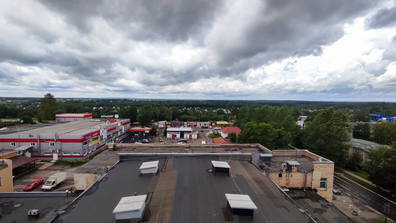 На фотографии запечатлён городской пейзаж с высоты, где на переднем плане видны крыши административных и торговых зданий с плоской кровлей, оборудованной вентиляционными шахтами. Слева выделяется современное торговое здание с красно-серым фасадом и множеством рекламных вывесок. За ним расположены автопарковка и ряды небольших павильонов. На горизонте просматриваются частные дома и густой зелёный лесной массив, уходящий вдаль. Небо затянуто плотными серыми облаками, создающими атмосферу дождливого дня. Фото отражает типичный облик окраины небольшого российского города и может использоваться для иллюстрации городской среды и архитектуры.