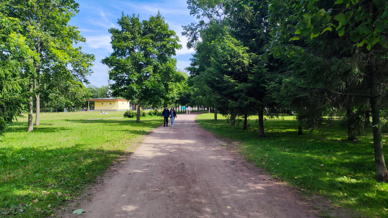 На фотографии изображена широкая тропа в парке, утопающая в зелени. Слева и справа от дорожки растут различные деревья и кустарники, на заднем плане видно небольшое жёлтое здание, возможно, хозяйственного назначения. По тропе идут пешеходы, что указывает на использование парка как места отдыха и прогулок. Снимок отражает особенности благоустройства и может быть применён в материалах о ландшафтном дизайне, городской инфраструктуре и рекреации.