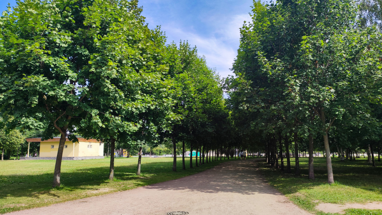 На изображении показана аллея, обсаженная рядами молодых деревьев. Дорожка ведет к открытому пространству парка, а слева на фоне заметно небольшое жёлтое здание. Тень от густой листвы создаёт комфортные условия для прогулок в летний день. Снимок можно использовать в публикациях о благоустройстве городских зон, озеленении и создании общественных пространств.