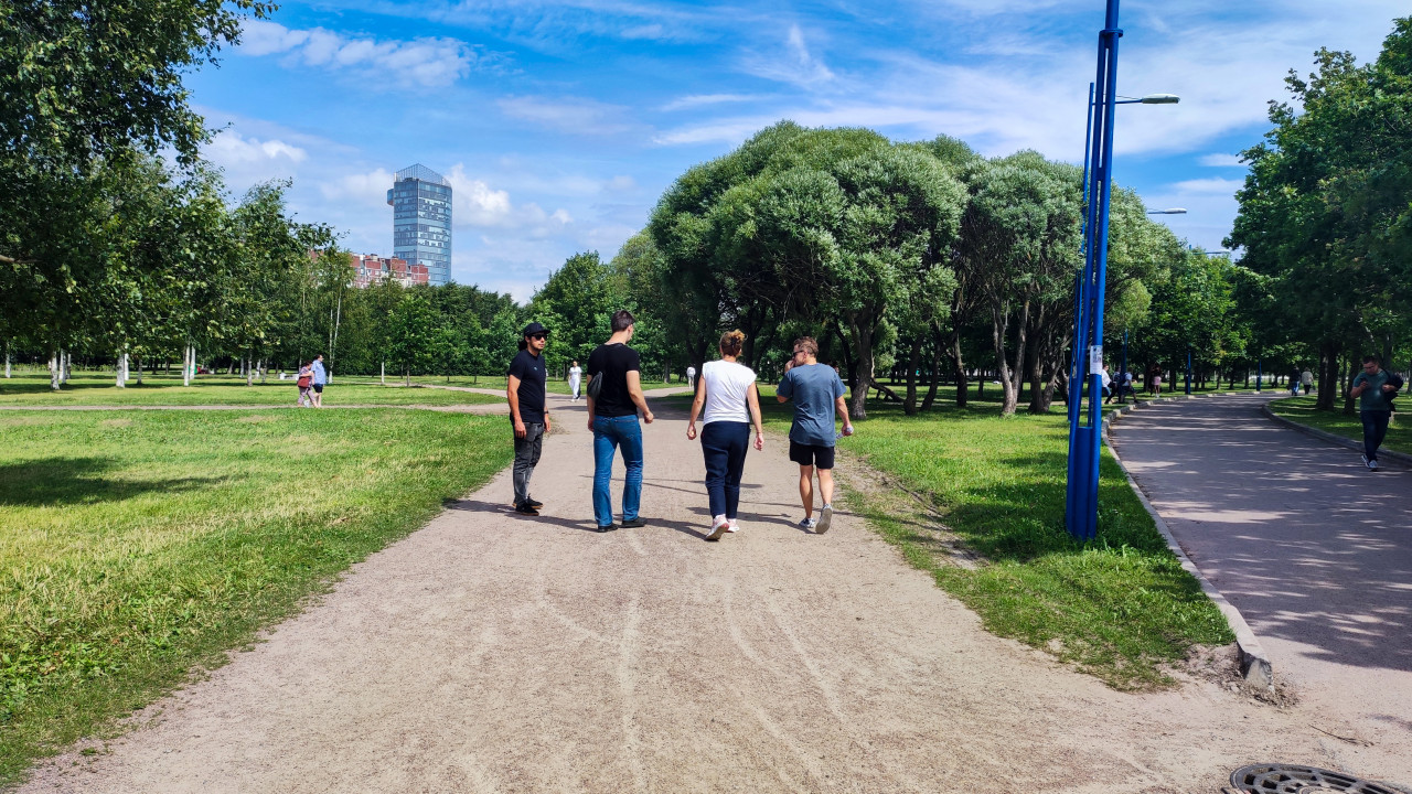 На фото запечатлена группа людей, идущих по пешеходной тропе в парке. Вдоль дорожки растут ухоженные деревья и кустарники, справа оборудована асфальтированная дорожка с синими фонарными столбами. На заднем плане виднеется современное высотное здание из стекла, возвышающееся над жилым кварталом. Снимок иллюстрирует элементы благоустройства парковой зоны и может быть использован для материалов о городской среде, отдыхе и спорте.
