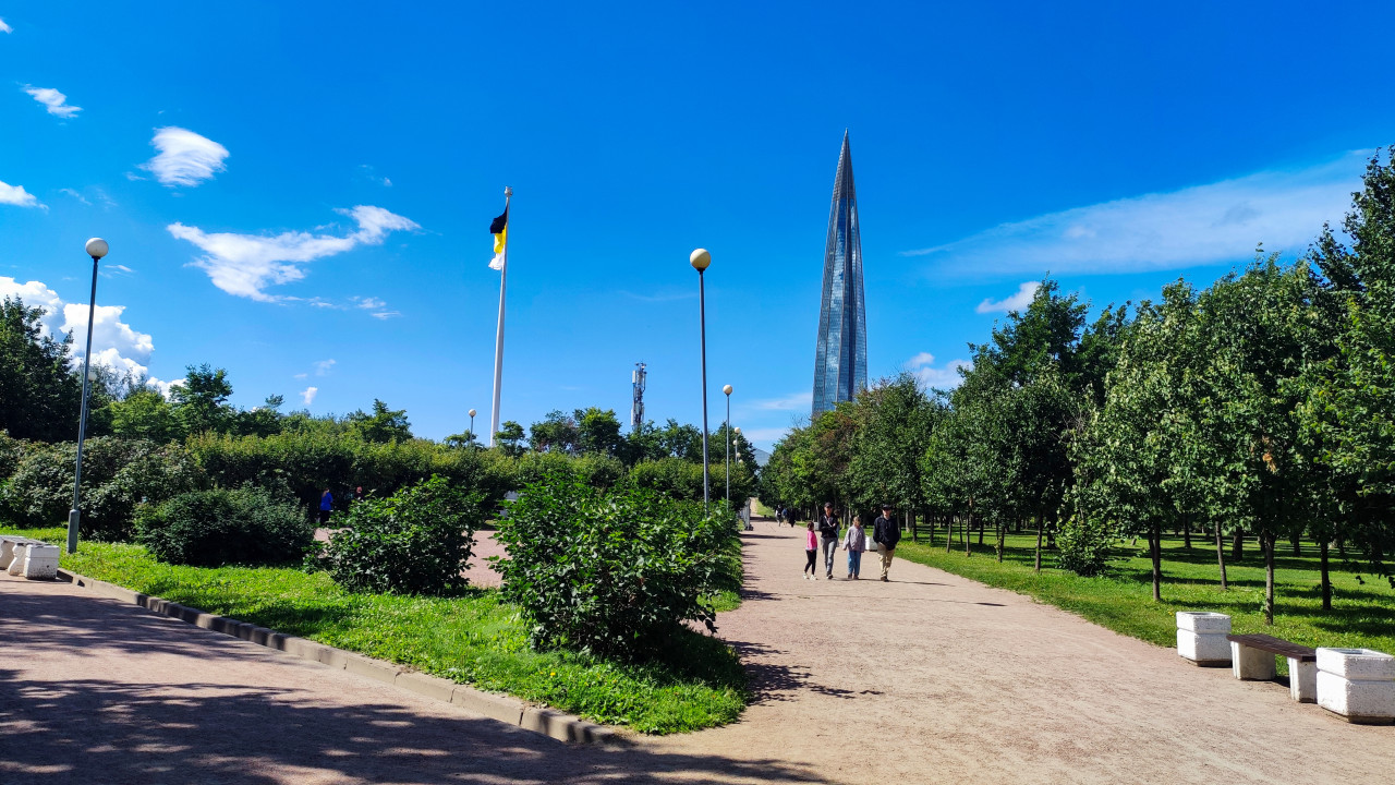 деревья парк зелёная зона трава газон кустарники природа экология городской пейзаж городская среда благоустройство озеленение общественное пространство отдых урбанизм Санкт Петербург Лахта центр Газпром небоскреб башня современная архитектура высотное здание шпиль имперский флаг чёрно жёлто белый флаг национальные символы дорожка люди прогулка пешеходы фонари Россия архитектура панорама современный город культурная среда инфраструктураПохожие фотографии