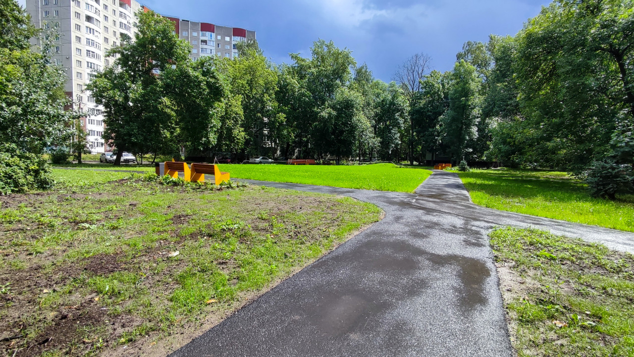 На фотографии показан участок двора после благоустройства: новая асфальтированная дорожка пересекает зелёную лужайку, вдоль которой установлены ярко-жёлтые деревянные скамейки. На заднем плане заметны высокие жилые дома панельного типа, характерные для городской застройки конца XX века. По периметру располагаются деревья, создающие тенистую зону. На асфальте видны следы влаги после недавнего дождя. Снимок иллюстрирует современное благоустройство дворовых территорий в городах.