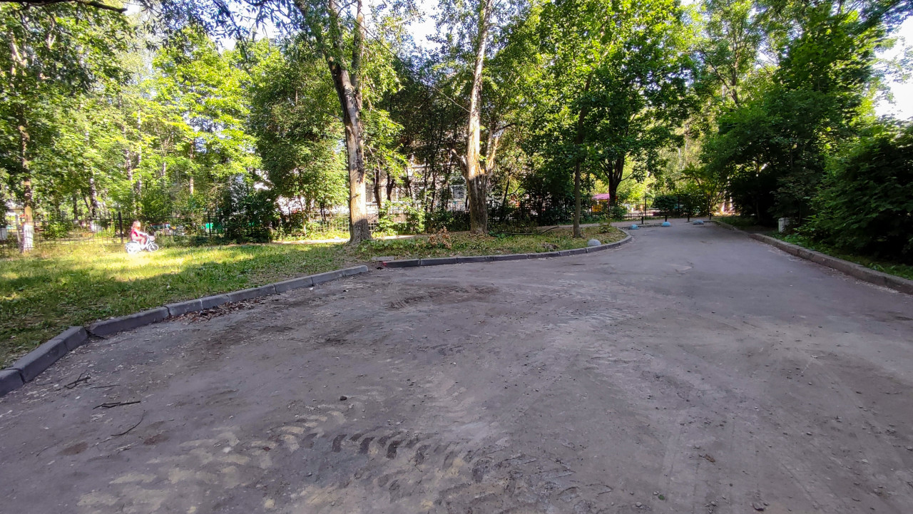 На фото показан участок дворовой территории после снятия старого асфальта и установки новых бордюров. На переднем плане заметны следы строительной техники на грунтовой поверхности. По краям дороги уложены бордюры, а вдоль них растут деревья. Сцена отражает этап подготовки основания перед укладкой щебня и асфальта. Изображение можно использовать для иллюстрации материалов о благоустройстве жилых районов и ремонте внутридворовых проездов.