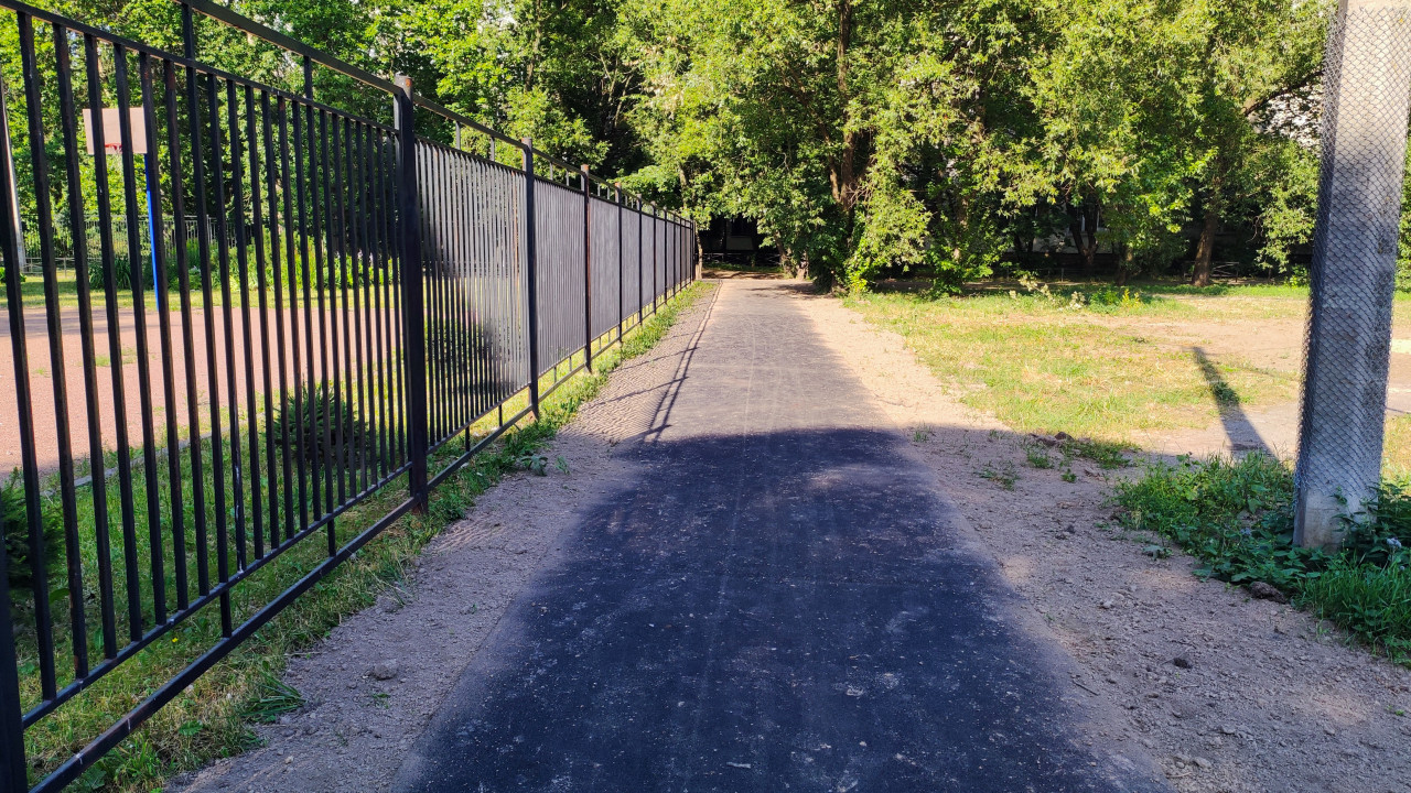 На изображении показана новая пешеходная дорожка с асфальтовым покрытием, идущая вдоль металлического забора спортивной площадки. Справа растут деревья, слева видна часть баскетбольной площадки. Поверхность дорожки свежая, с ровным покрытием. Сцена отражает этап благоустройства общественной территории. Фотографию можно использовать для статей о строительстве и ремонте тротуаров, благоустройстве дворов и создании городской инфраструктуры.