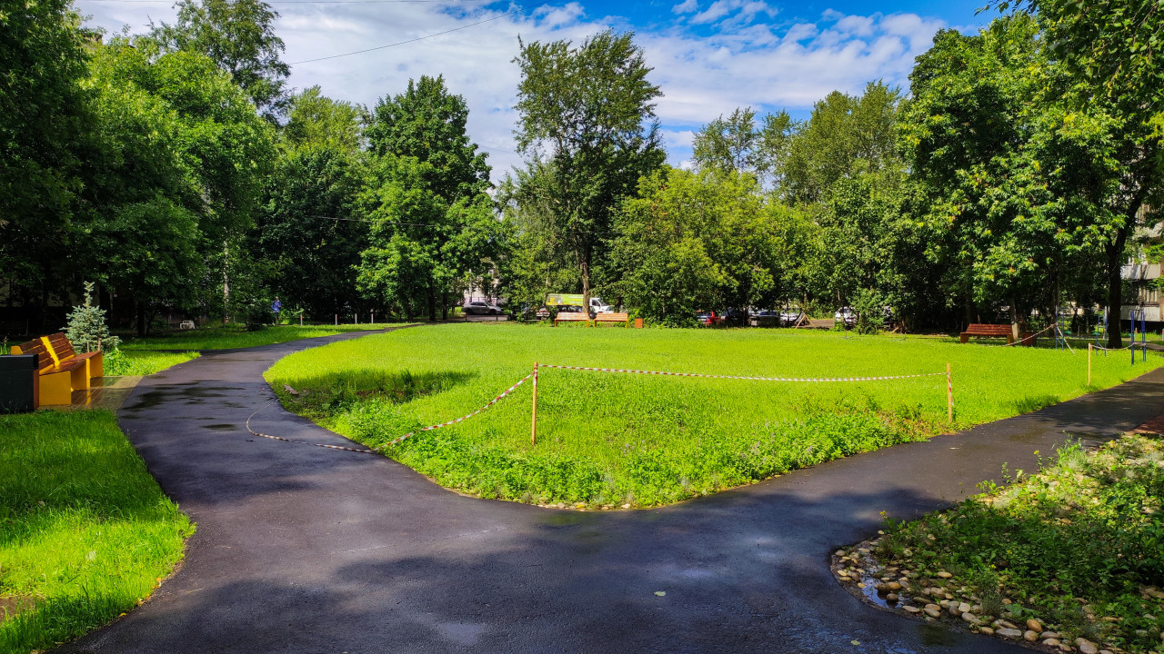На снимке изображена круглая озеленённая площадка во дворе жилого массива, окружённая асфальтированными дорожками. По краям зоны расположены жёлтые и деревянные скамейки для отдыха, а сама лужайка ограждена сигнальной лентой, что указывает на недавние работы по посадке травы или благоустройству территории. Вокруг площадки растут высокие деревья, на заднем плане видны автомобили и элементы жилой застройки. Сцена отражает создание современного общественного пространства в жилых районах.