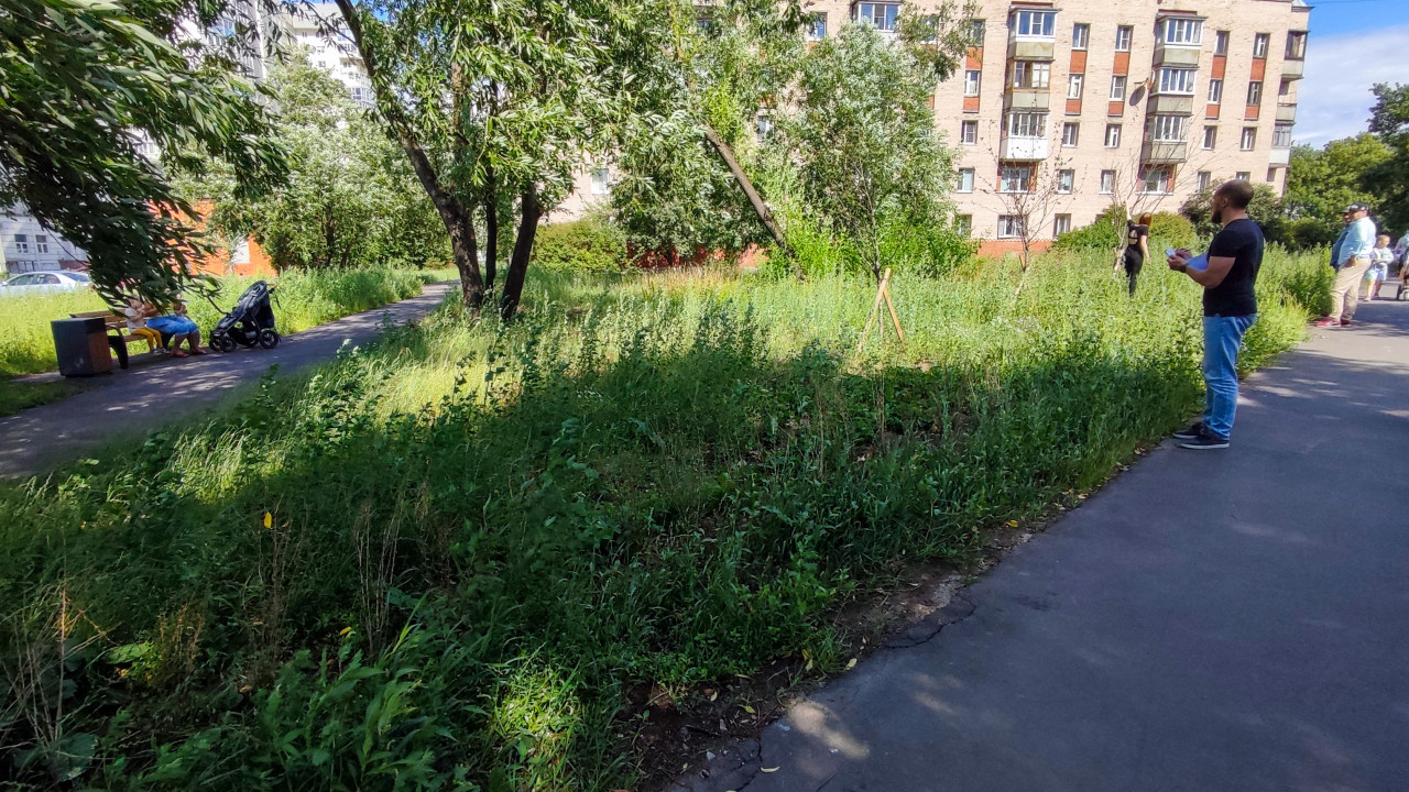 На фото изображен участок двора, где несколько человек находятся на асфальтовой дорожке рядом с газоном с высокой травой и кустарниками. На заднем плане виден многоквартирный дом советской постройки. На переднем плане — мужчина с документами и коляска у скамейки. Снимок отражает процесс осмотра придомовой территории и её благоустройства жителями.