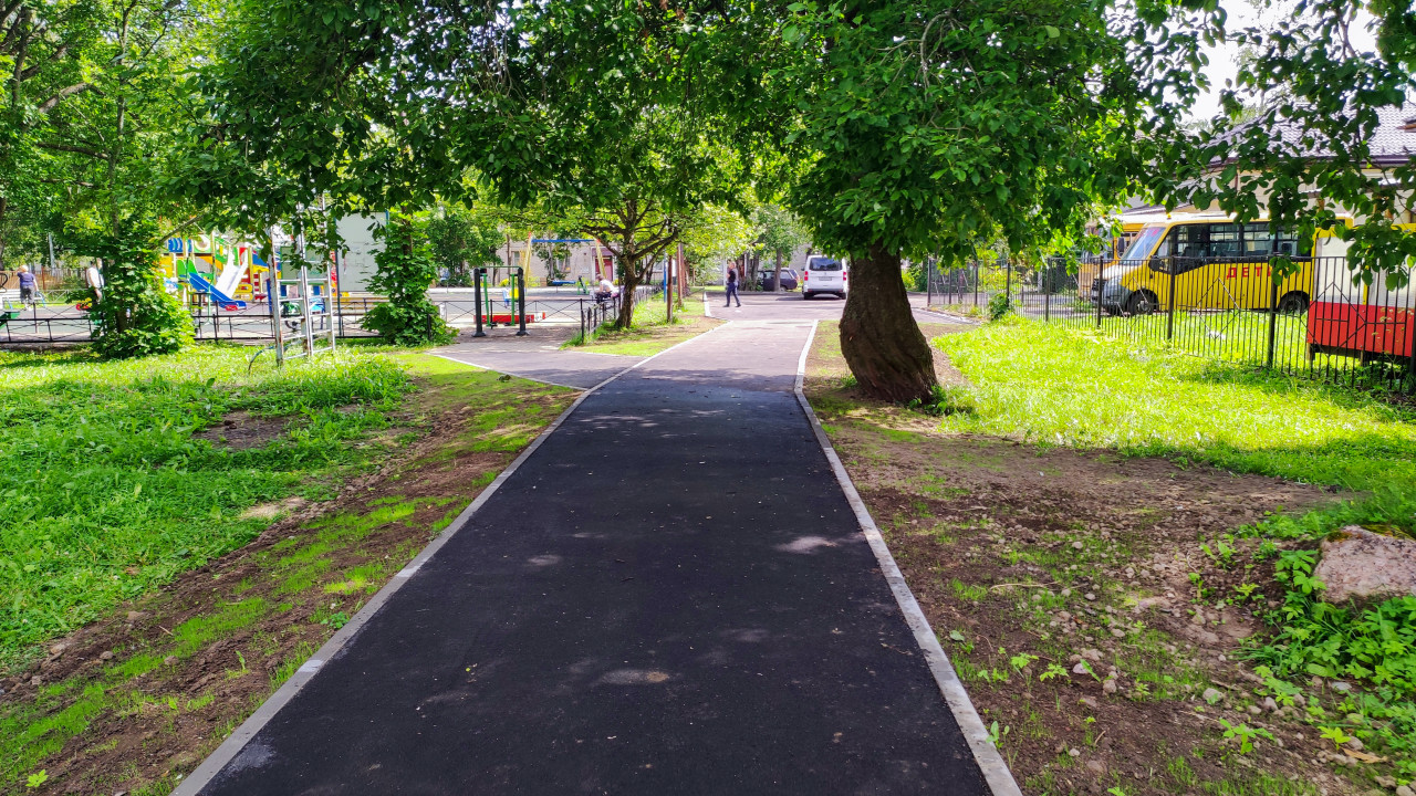 На фотографии изображена новая асфальтовая дорожка, проложенная через дворовую территорию с густой зеленью. Вдоль дорожки растут деревья и кустарники, на заднем плане видны детская площадка и припаркованные автомобили, включая жёлтый автобус. Также можно заметить металлический забор и жилые дома. Снимок демонстрирует завершённый этап благоустройства пешеходных маршрутов в жилом квартале. Фотография может быть использована для иллюстраций о ремонте дворов, благоустройстве, организации общественных пространств.