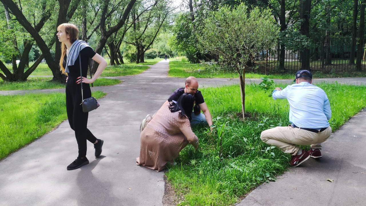 На фото изображена группа людей, которые ухаживают за растительностью во дворе жилого дома. Двое человек присели, удаляя сорняки, ещё один работает рядом с молодым деревом, а женщина стоит на дорожке. Вокруг расположена зелёная зона с травой и кустарниками, а также пешеходные дорожки. Снимок иллюстрирует участие жильцов в уходе за двором и озеленении территории.