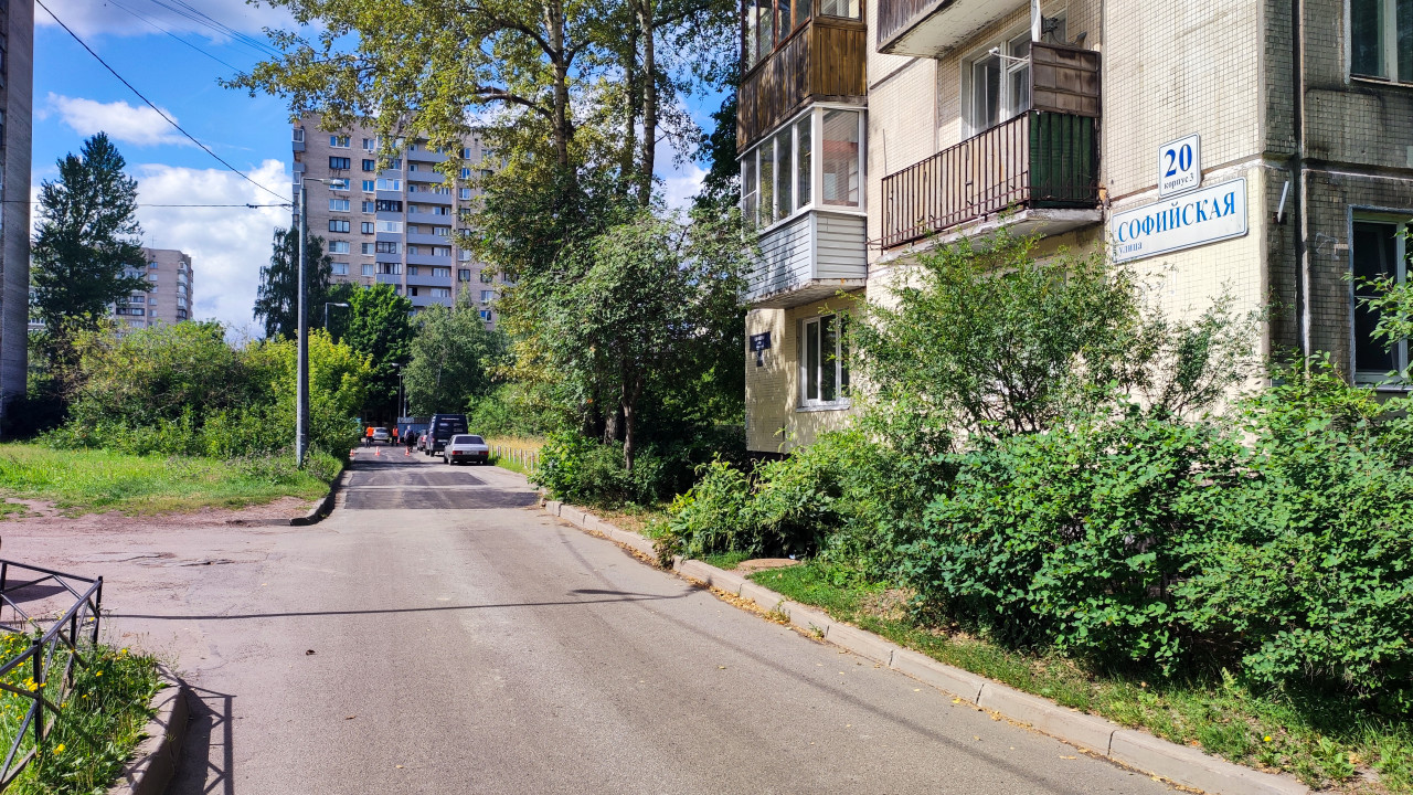 На фото показан вид на улицу с асфальтированным дорожным покрытием и бордюрами вдоль жилого квартала. На стене дома справа находится табличка с адресом «Софийская улица, дом 20, корпус 3», указывающая расположение объекта в Санкт-Петербурге. Вдоль дороги видны припаркованные автомобили, деревья и многоквартирные жилые дома советской постройки. Снимок не содержит культурных памятников, но фиксирует типичную городскую среду. Фото можно использовать в материалах о городской застройке, транспорте и благоустройстве.