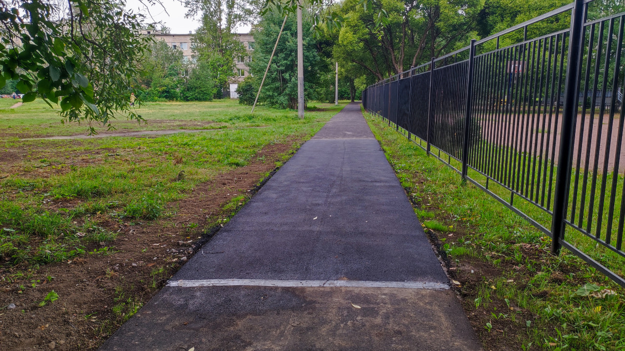 Снимок демонстрирует пешеходную дорожку с новым асфальтовым покрытием, проложенную вдоль металлического ограждения спортивной или общественной площадки. Дорожка уходит вглубь кадра, по обе стороны видны газоны и зелёные насаждения. Вдали заметны здания жилого квартала. Фотография отражает процесс благоустройства городской среды и может использоваться в материалах о строительстве, инфраструктуре и благоустройстве территорий.