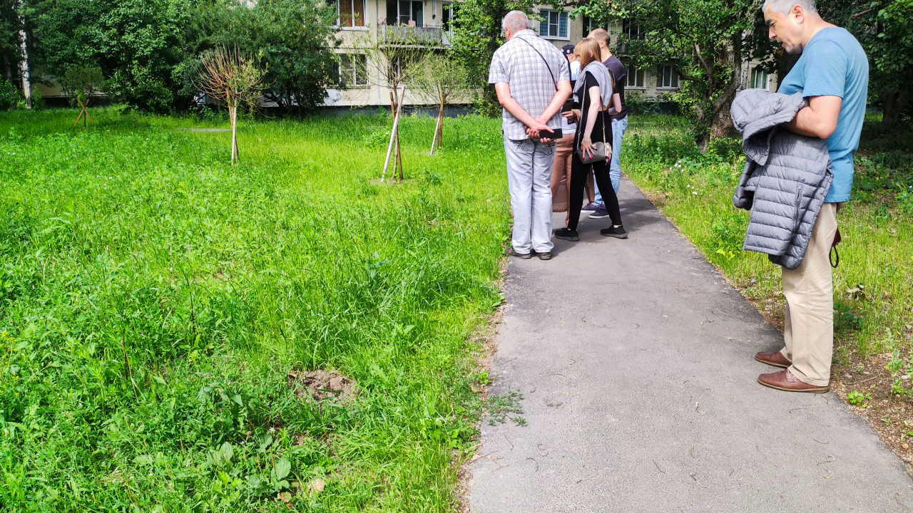 На снимке показана группа жильцов, собравшихся на пешеходной дорожке во дворе многоэтажного дома. Они осматривают посадки молодых деревьев и состояние газона. На заднем плане виден фасад жилого дома и густая растительность. Фотография фиксирует участие жителей в контроле благоустройства двора и состоянии зелёных насаждений.