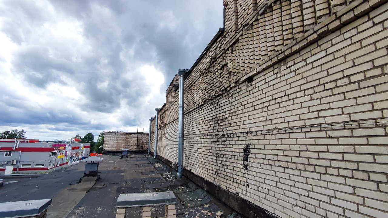 На фото изображена длинная кирпичная стена промышленного или административного здания, с которой отходят металлические вентиляционные трубы. Видны следы разрушений и выпадения кирпичей, а также потемнения на поверхности. На крыше заметно рулонное покрытие, местами покрытое строительным мусором. На заднем плане различимы современные торговые здания с красно-серым фасадом и рекламными вывесками. Кадр отражает особенности городской застройки и состояние старых промышленных построек.