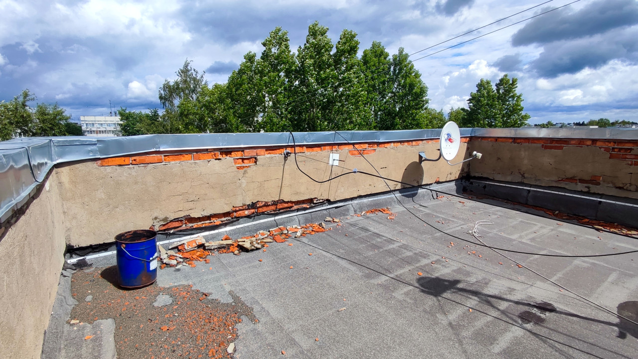 крыша плоская крыша кровля здание урбанистика инфраструктура городская среда крыша дома разрушение кладки осыпающаяся штукатурка кирпич кирпичная стена обломки кирпичей спутниковая антенна антенна кабели проводка трещины кровельное покрытие рулонная кровля ремонт кровли обслуживание зданий технический осмотр городская архитектура советская застройка многоэтажный дом жилой дом эксплуатация зданий проблемы ЖКХ аварийное состояние деревья облачность дождьПохожие фотографии