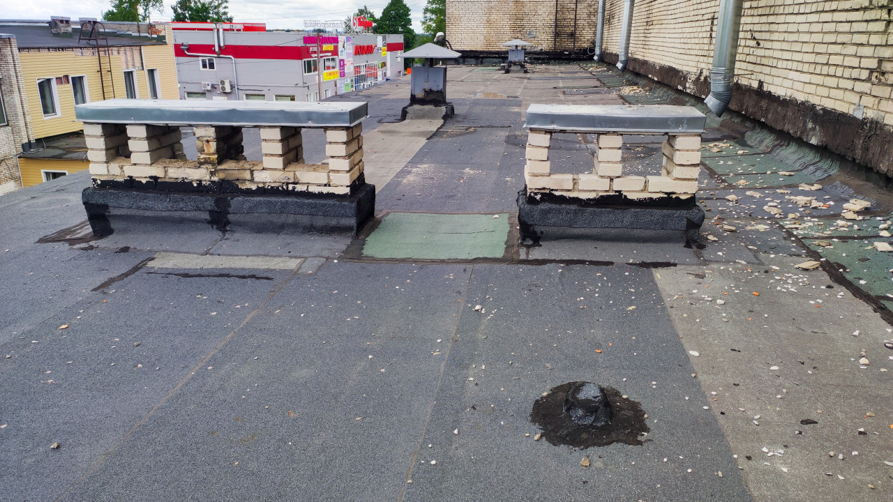 На фотографии изображена плоская крыша здания, покрытая рулонным материалом и оборудованная вентиляционными шахтами из кирпича с металлическими накрытиями. В центре видны инженерные элементы и следы ремонта покрытия, а на фоне — фасады соседних зданий и торговый центр с яркими вывесками. На крыше заметны остатки строительного мусора и следы эксплуатации. Снимок иллюстрирует техническое состояние кровли и может использоваться для тем, связанных со строительством, ремонтом и обслуживанием зданий.