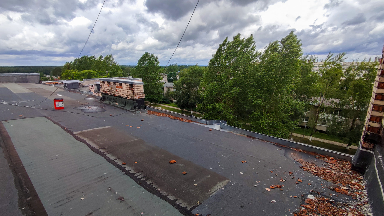 крыша плоская крыша кровля здание урбанистика инфраструктура городская среда рулонное покрытие кирпич обломки кирпича строительные дефекты дефекты крыши строительная тара ремонт эксплуатация зданий техническое состояние обследование крыши ЖКХ инженерное обслуживание жилой фонд жилые дома советская архитектура застройка проблемы эксплуатации дефекты фасада инженерные системы облачная погода деревьяПохожие фотографии