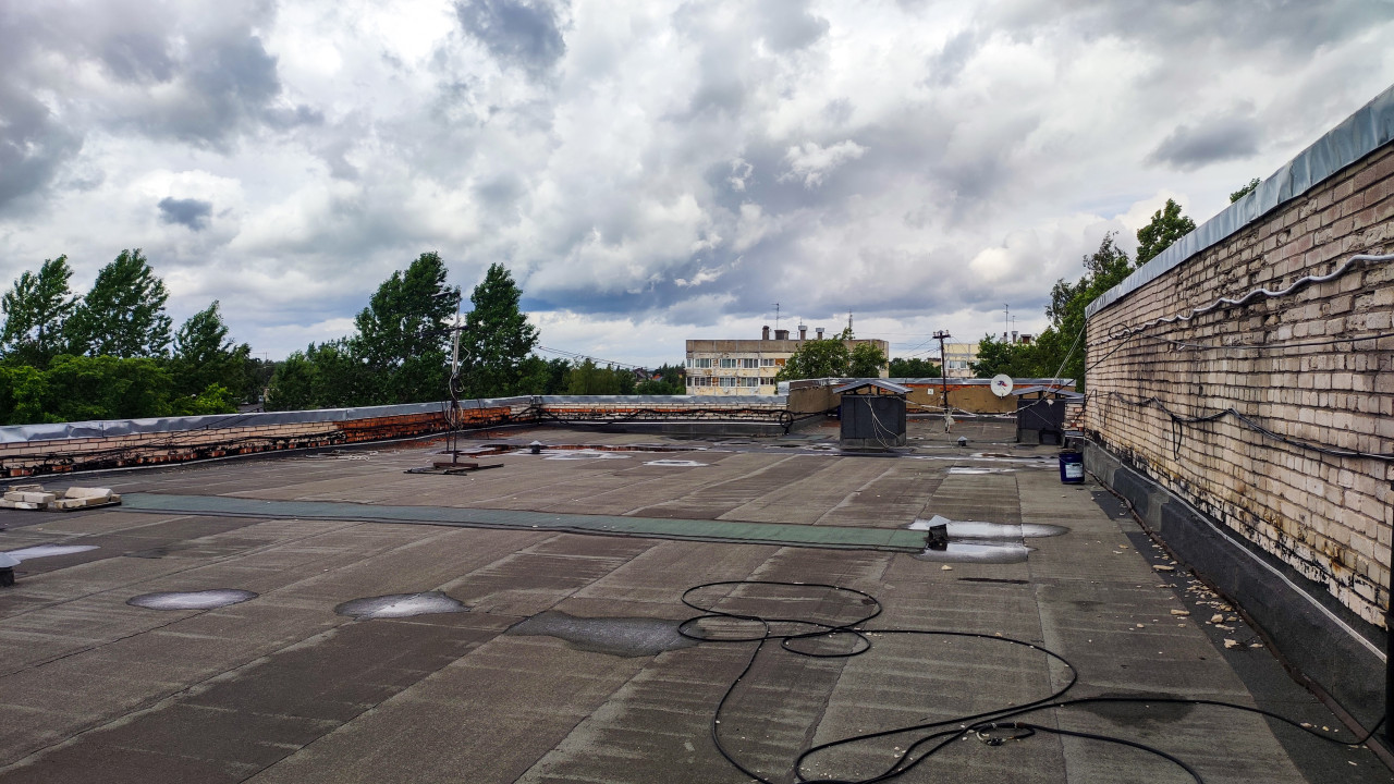 крыша плоская крыша кровля здание урбанистика инфраструктура городская среда жилой дом многоэтажка техническое помещение вентиляция кабели электропроводка битумное покрытие рулонная кровля после дождя влажность дренаж кирпичная стена эксплуатация зданий ремонт кровли осмотр крыши техническое состояние обслуживание зданий проводка на крыше ЖКХ городская архитектура здания СССР типовая застройка облачная погода деревья за домом технический осмотрПохожие фотографии