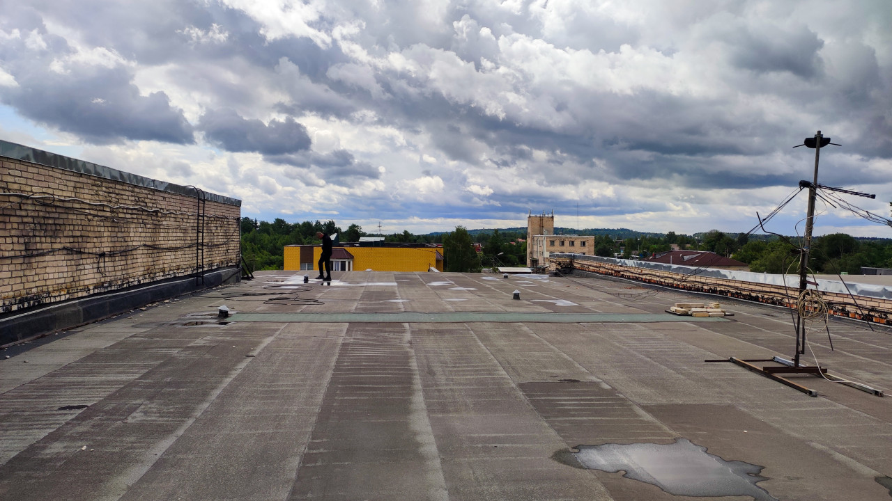 Фотография демонстрирует плоскую крышу многоэтажного жилого здания. Поверхность крыши покрыта рулонным материалом, заметны следы влаги после дождя. В кадре видны кабели, закрепленные вдоль кирпичной стены, а также металлическая конструкция с проводами. На заднем плане — жилые и административные здания, деревья и облачное небо. На крыше стоит человек в темной одежде, что указывает на процесс осмотра или ремонта. Съемка выполнена днем. Объектов культурного наследия в кадре нет. Фотографию можно использовать в материалах о техническом состоянии зданий, ремонте кровель и городской инфраструктуре.