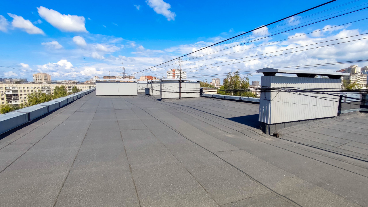 Фотография сделана на крыше жилого дома. Видны плоская кровля с новым покрытием, технические надстройки, вентиляционные шахты и кабельные линии. На заднем плане — панорама жилого массива с многоэтажными домами и голубым небом. Снимок иллюстрирует состояние кровли после ремонта и может использоваться в материалах о строительстве, обслуживании зданий и инженерных системах.
