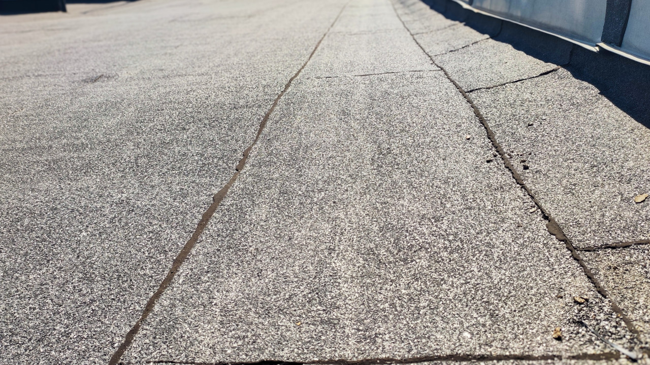 На изображении показана поверхность плоской крыши с рулонным покрытием. Четко видны стыки и швы материала, идущие вдоль крыши. Фотография фиксирует состояние кровельного покрытия и его монтажные особенности. Такой снимок может применяться в материалах о строительных технологиях, инспекции состояния зданий и ремонте кровли.