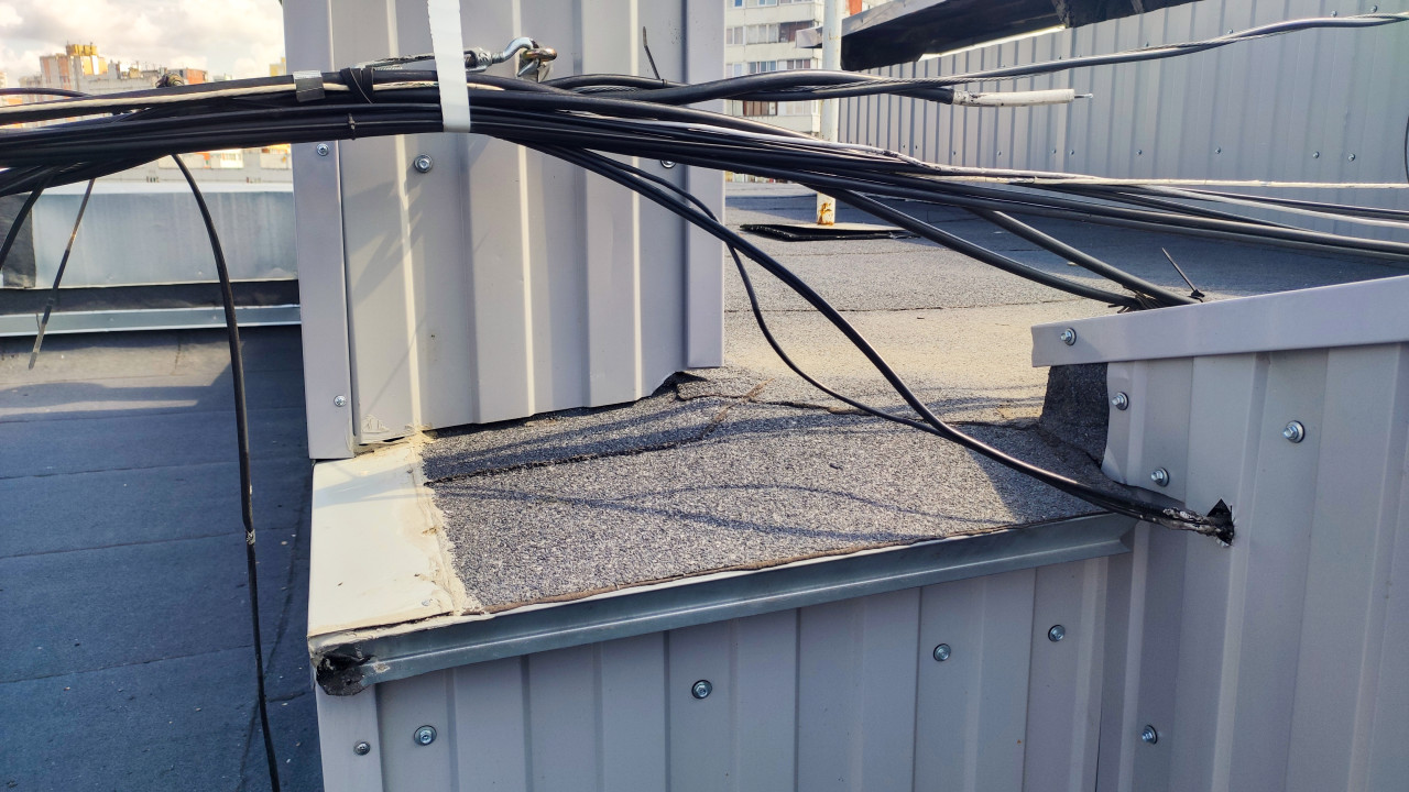 На изображении представлен фрагмент плоской крыши, где через инженерный блок проходят кабельные линии. Конструкция облицована профилированным листом и закреплена на основании из рулонного гидроизоляционного материала. Видно множество кабелей, уложенных по поверхности и закрепленных с помощью пластиковых стяжек. Снимок можно использовать для материалов о монтаже и эксплуатации инженерных коммуникаций на крышах жилых и административных зданий.