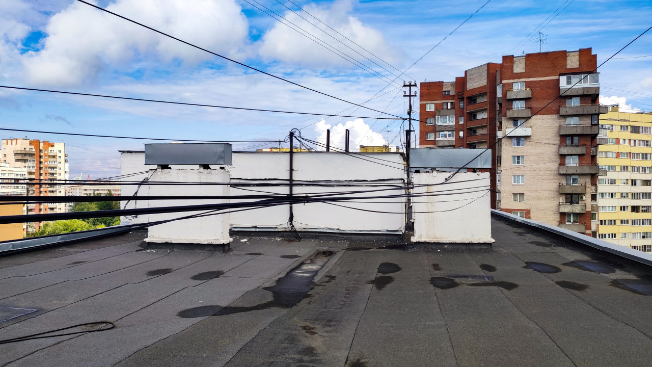 Снимок показывает плоскую крышу многоквартирного дома с вентиляционными шахтами и большим количеством натянутых кабелей, соединяющих инженерные узлы. На поверхности кровли видны следы влаги и пятна от дождя, выполненное рулонное покрытие и дренажные каналы для отвода воды. На фоне заметны жилые дома с панельной и кирпичной застройкой конца XX века. Фотография иллюстрирует техническое состояние крыши и может использоваться для материалов о ремонте кровли, городских коммуникациях и системах обслуживания домов.