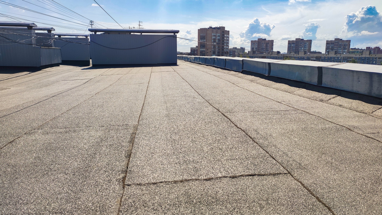 На фотографии изображена плоская крыша многоквартирного дома с уложенным покрытием. Вдоль крыши проходят электрические кабели, закрепленные на опорах. На заднем плане видны многоэтажные жилые дома и облака на голубом небе. Снимок демонстрирует конструктивные особенности плоской кровли и может использоваться в материалах о строительстве, ремонте и эксплуатации зданий.