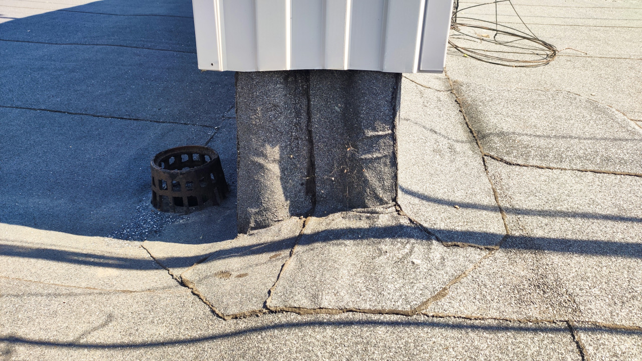Фотография демонстрирует часть плоской крыши многоквартирного дома с покрытием из рулонных материалов. На переднем плане виден водосточный элемент в металлической решетке и участок примыкания крыши к обшивке технической конструкции, покрытой листами. На поверхности заметны кабельные линии. Кадр можно использовать в публикациях о строительстве и эксплуатации кровельных систем.