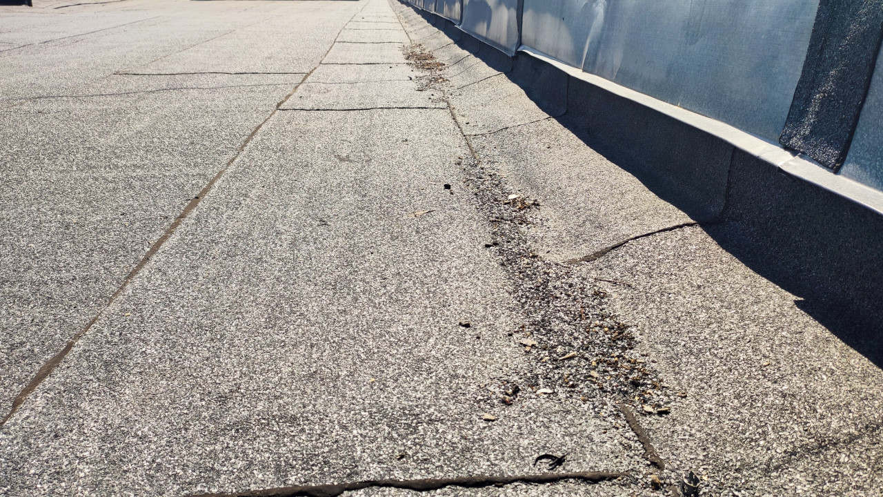 На фото изображен участок плоской крыши многоквартирного дома с рулонным покрытием. Вдоль стыков материала видны следы повреждений и скопившийся мусор. Металлическая обшивка парапета фиксирует край крыши. Снимок иллюстрирует эксплуатационные особенности и может быть использован в материалах о контроле состояния кровли, строительных технологиях и ремонте зданий.