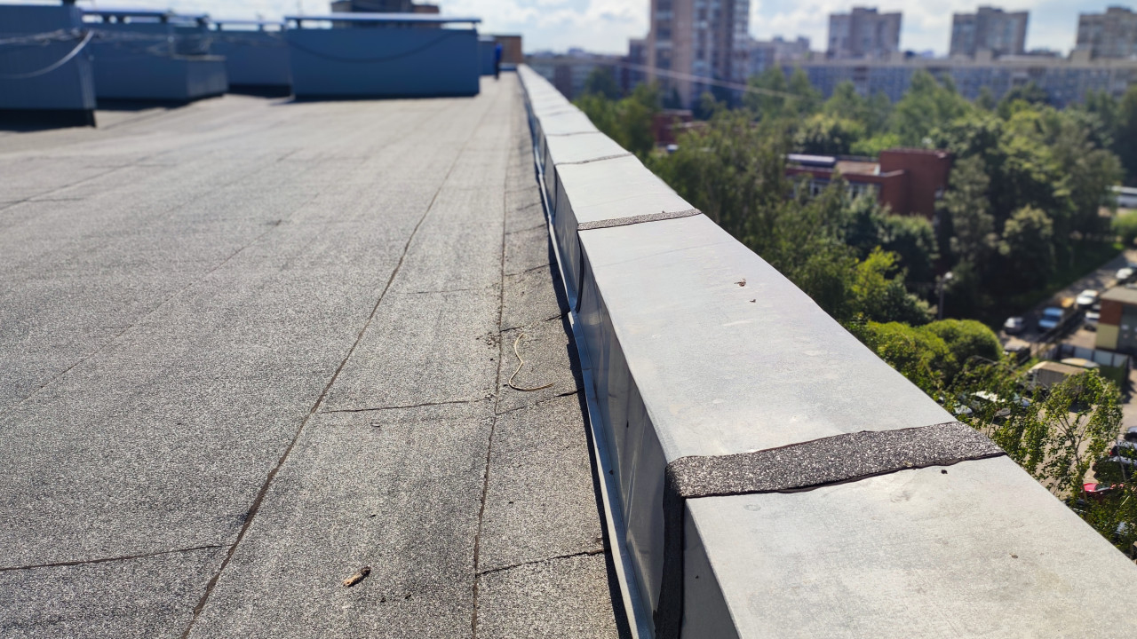 На изображении показан парапет плоской крыши с металлическим покрытием, за которым открывается вид на жилой квартал с многоэтажными домами. На крыше уложено рулонное гидроизоляционное покрытие, видны его швы и отдельные следы эксплуатации. Парапет выполнен из бетона с защитным металлическим элементом сверху. Фото подходит для использования в материалах о городской архитектуре, строительных конструкциях и особенностях эксплуатации крыш в жилых районах.