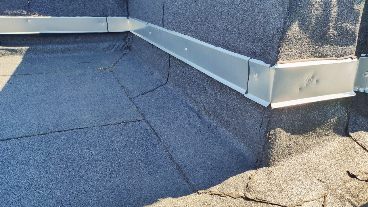 На фото изображен фрагмент плоской крыши, где рулонное гидроизоляционное покрытие примыкает к стене. Для защиты стыка используется металлический отлив, закрепленный саморезами и герметиком. Видны соединения отдельных элементов и места сжатия материала. Визуально заметны неровности покрытия и трещины в отдельных местах. Такой снимок может использоваться в статьях о строительных технологиях, ремонте кровли, правильной организации примыканий и предотвращении протечек в зданиях.
