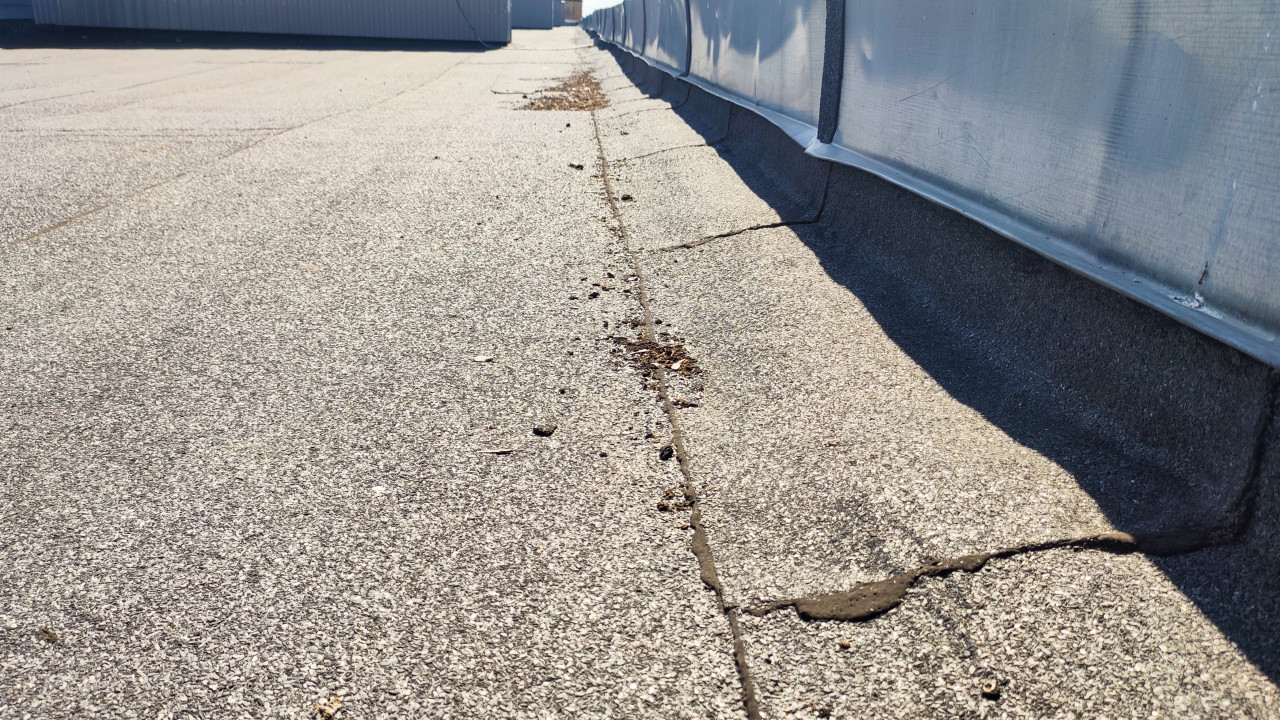 На фото показан участок плоской крыши с рулонным гидроизоляционным покрытием. Вдоль стены видны линии швов и следы дополнительной герметизации. На поверхности скопились листья и мелкий мусор, что указывает на необходимость регулярного обслуживания кровли. Металлический отлив защищает примыкание стены и кровельного покрытия. Снимок фиксирует детали технического состояния крыши и может использоваться для иллюстрации тем о строительных материалах, обслуживании зданий, эксплуатации инженерных конструкций и ремонте.