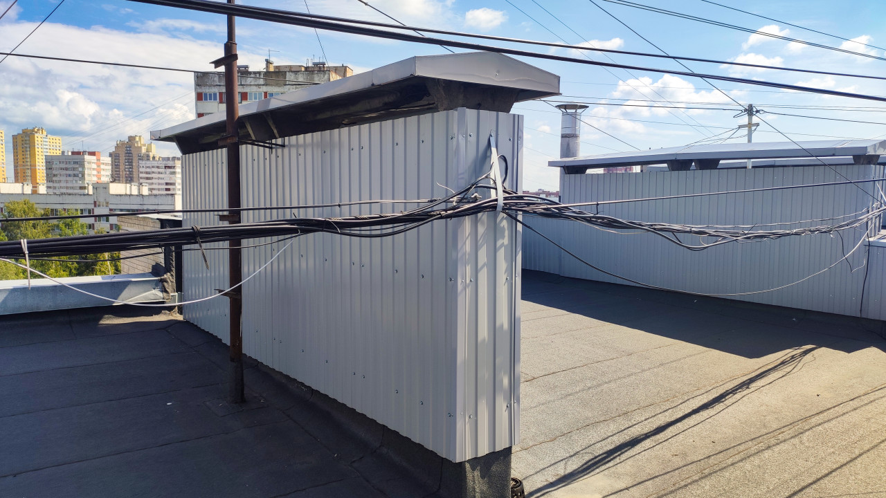 На фото изображен инженерный блок, облицованный профилированным листом, установленный на плоской крыше жилого здания. Вокруг конструкции проходят многочисленные кабельные линии, закрепленные к металлическим опорам. В кадре также видны соседние блоки и жилые дома на заднем плане. Снимок передает детали технического состояния крыши и может быть использован для иллюстрации тем о городской инфраструктуре, монтаже инженерных систем и эксплуатации зданий.