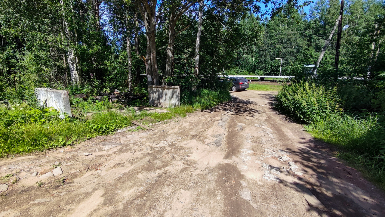 На изображении виден участок грунтовой дороги, по обе стороны которой расположены бетонные блоки и заросли кустарников. В кадре присутствует легковой автомобиль, припаркованный ближе к железнодорожным путям, которые заметны на заднем плане. Дорога частично повреждена, на поверхности видны выбоины. Съёмка велась днём при ясной погоде. Объектов культурного наследия в кадре нет. Фотография может использоваться для иллюстрации транспортной доступности загородных территорий, дорожных условий и инженерных сооружений.