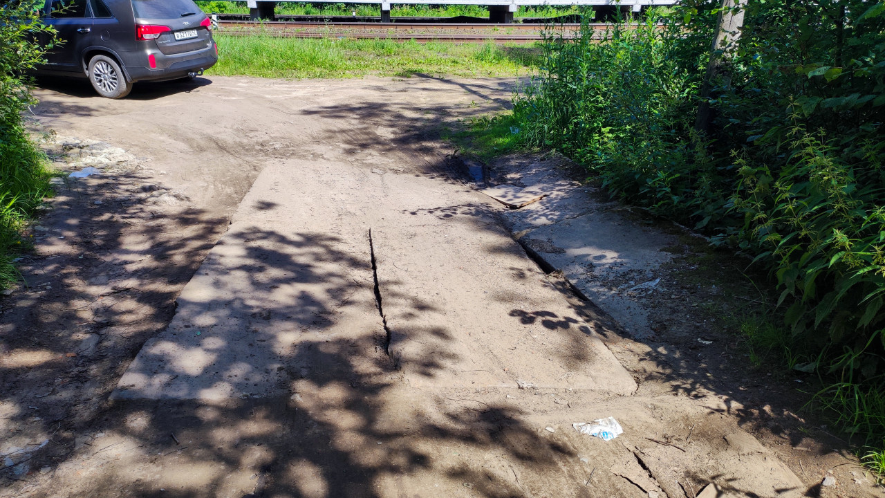 Фотография показывает грунтовую дорогу, ведущую к железнодорожным путям. На переднем плане уложены бетонные плиты с трещинами. Слева припаркован автомобиль. На заднем плане видны рельсы и зелёные заросли вдоль железнодорожного полотна. Съёмка выполнена днём при солнечной погоде. Культурно-исторических объектов в кадре нет. Снимок может быть использован в материалах о транспортной инфраструктуре, состоянии сельских дорог и особенностях загородного сообщения.