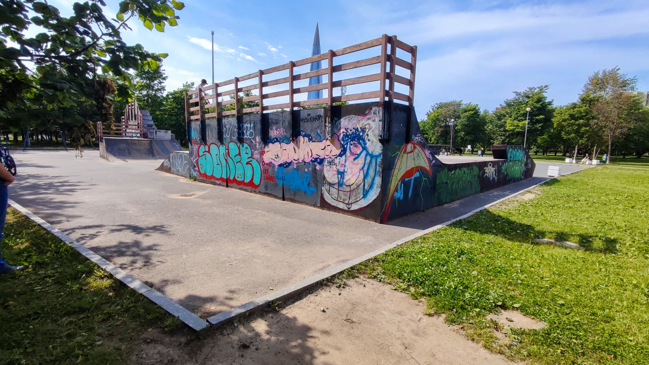 На фотографии показан скейт-парк с рампами и граффити на бетонных конструкциях. В глубине кадра виден шпиль небоскрёба Лахта Центр, построенного в 2019 году в Санкт-Петербурге и являющегося важным символом современной архитектуры города. Вокруг площадки расположена зелёная зона с газоном и деревьями, также видны пешеходные дорожки. Фото отражает сочетание спортивной и архитектурной среды и может использоваться для материалов о спорте, городской инфраструктуре и современных достопримечательностях.