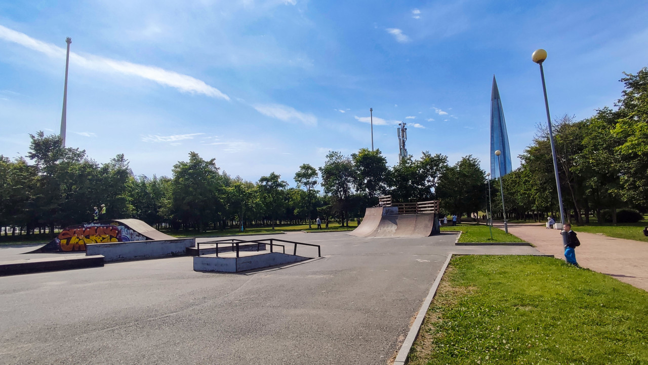 На фото показана площадка для скейтбординга с рампами и препятствиями, расположенная в городской зелёной зоне. На заднем плане среди деревьев возвышается башня Лахта Центр — современный небоскрёб в Санкт-Петербурге, построенный в 2019 году и ставший самым высоким зданием Европы. На переднем плане видны бетонные конструкции и граффити, а также фонари вдоль аллеи. Изображение отражает сочетание спортивной инфраструктуры и значимого архитектурного объекта. Подходит для материалов о городской среде, спорте и архитектуре.