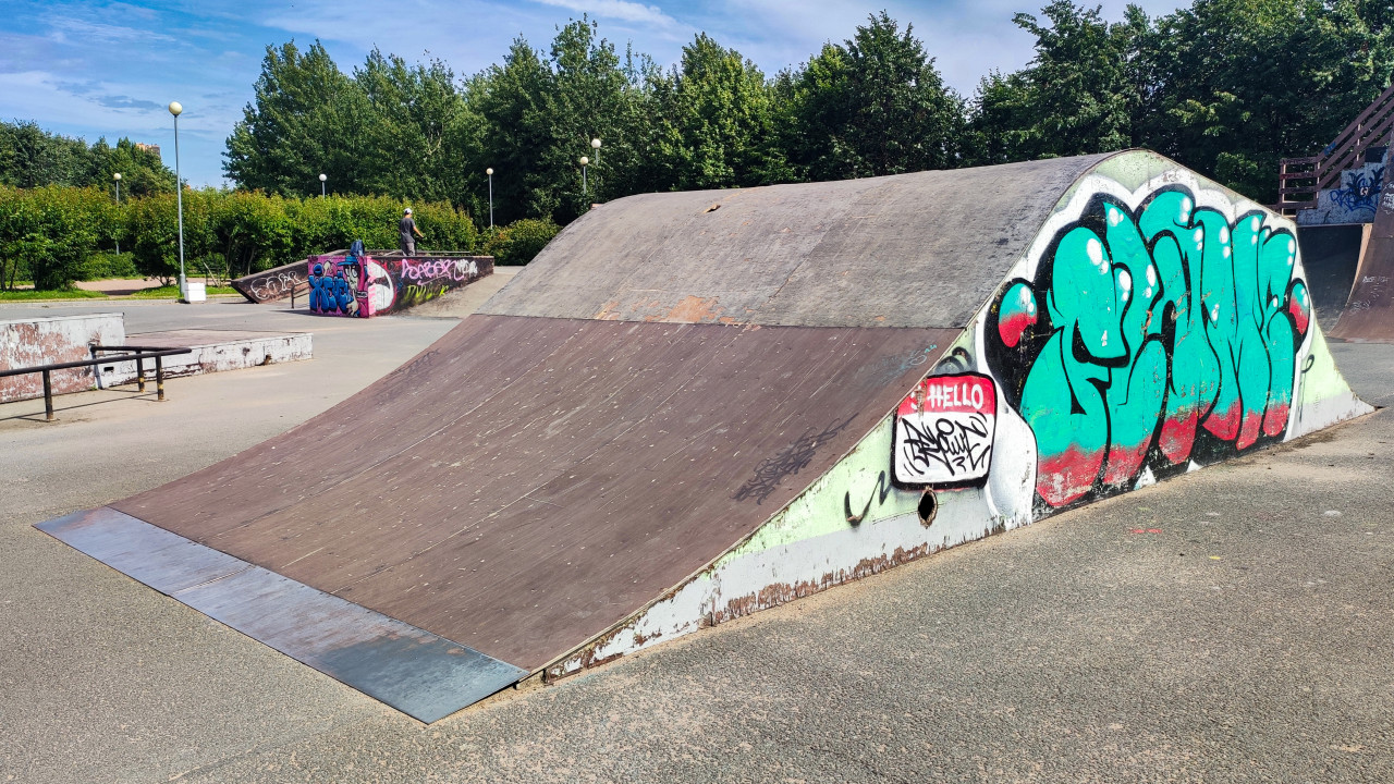 Снимок показывает рампу для катания в скейтпарке, сделанный под углом. Поверхность конструкции деревянная, с металлическими вставками у основания, заметны следы износа и небольшие повреждения. Боковая часть рампы разрисована граффити с надписями и яркими цветами. На заднем плане видны деревья, фонари и другие элементы парка. Сцена отражает городскую спортивную инфраструктуру и уличное искусство, характерное для скейтпарков. Фото может быть использовано в материалах о развитии молодёжной культуры и экстремальных видах спорта.