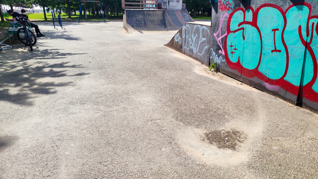На фото изображён участок скейт-парка с граффити на бетонной стене. Справа виден элемент рампы, слева — скамейка с двумя подростками и велосипедами. Покрытие площадки асфальтовое, на нём заметны следы износа. На заднем плане частично видны металлические конструкции для катания. Снимок сделан в дневное время при ясной погоде. Фото может использоваться для материалов о городской среде, молодёжной культуре и инфраструктуре.