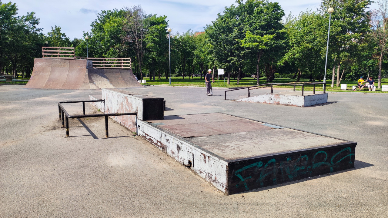 Фотография показывает скейтпарк с несколькими элементами для катания, включая платформы с перилами и деревянные рампы. На переднем плане видна прямоугольная конструкция для скольжений, за ней расположены другие элементы парка. По центру кадра находится подросток с самокатом, а справа на лавке сидят люди. Вдалеке виднеются высокие рампы с ограждениями и деревья парковой зоны. Фото отражает устройство спортивных площадок и может быть использовано для статей о городских зонах активного отдыха.
