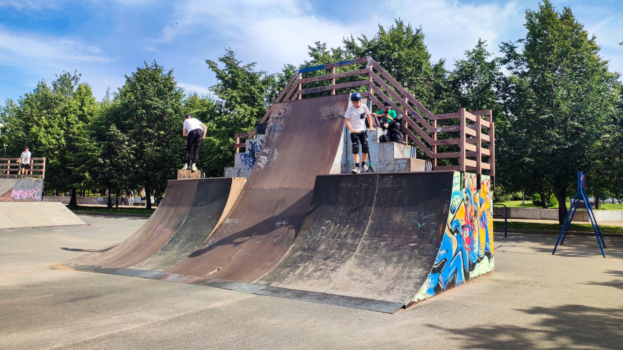 скейт парк скейтбординг экстремальные виды спорта спорт спортплощадка урбанизм городская среда инфраструктура активный отдых скейтпарк рампа самокат дети подростки уличный спорт трюки парк деревья лето отдых досуг граффити деревянная конструкция износ покрытия подростковая культура самокатинг спортивная площадка уличная культура бетонное покрытие зелёные насаждения защитное снаряжение спорт для молодёжиПохожие фотографии