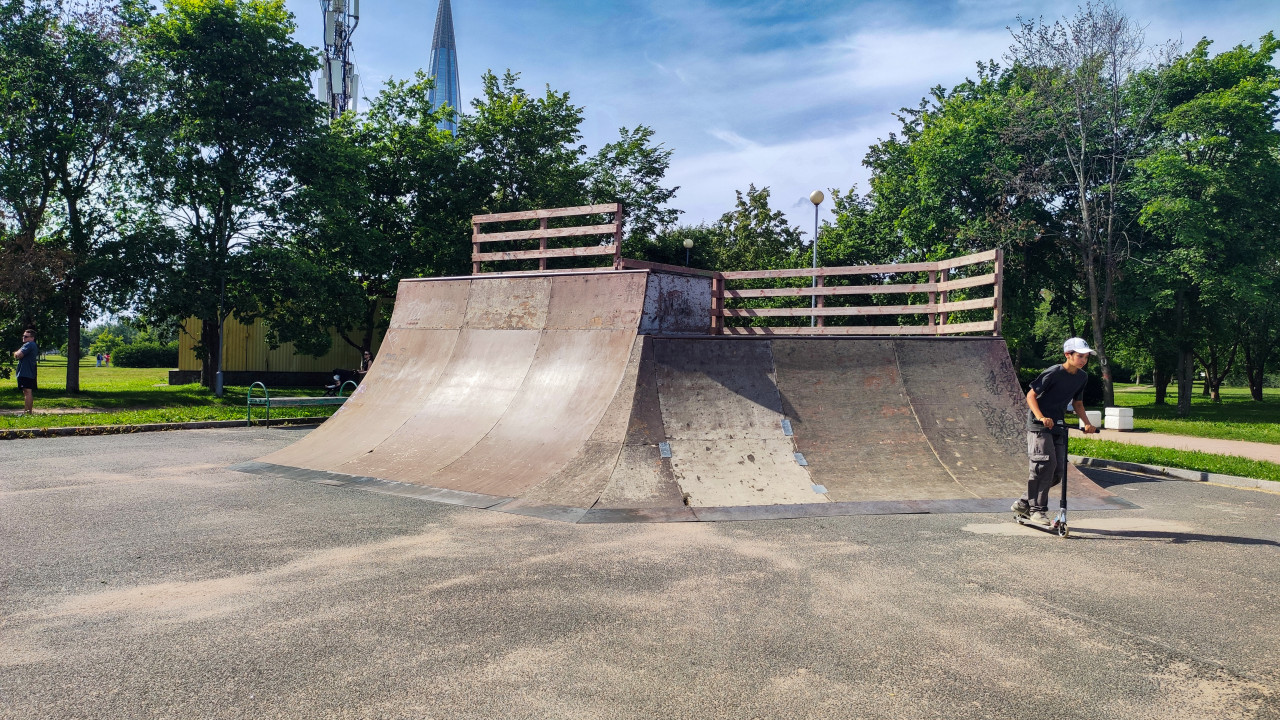 На снимке изображён подросток в кепке и спортивной одежде, катающийся на трюковом самокате у рампы в скейтпарке. На заднем плане видна большая деревянная конструкция с металлическими элементами и ограждениями, заметны следы износа покрытия. За деревьями возвышается шпиль здания «Лахта Центра» — современного небоскрёба в Санкт-Петербурге, построенного в 2012–2019 годах. Фото фиксирует элементы городской спортивной инфраструктуры на фоне современной архитектуры и может использоваться в материалах о спорте, урбанизме и городских пространствах.