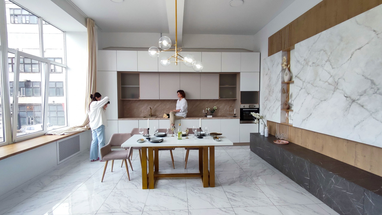 На фотографии изображена кухня-гостиная с современным дизайном, в центре которой стоит белый стол с золотыми ножками и сервировкой. На столе бокалы, тарелки и бутылка вина, рядом стоят мягкие стулья. На фоне у кухонного гарнитура сидит женщина, в руках у неё букет роз. Слева фотограф с камерой снимает процесс. На стене видны декоративные панели с мраморной текстурой и полки с вазами. Снимок демонстрирует рабочий процесс фотосессии в интерьере и может быть использован для публикаций о дизайне помещений, lifestyle и рекламной съемке.