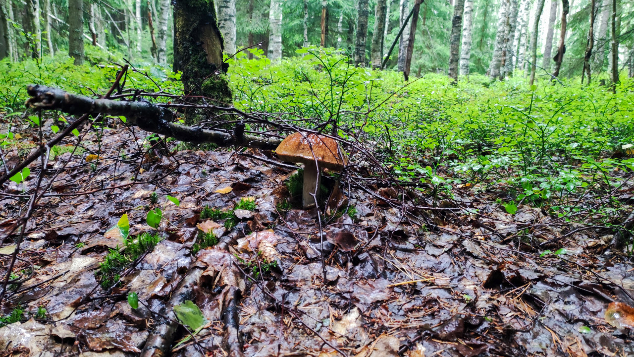 На фото показан гриб с коричневой шляпкой, растущий среди опавших листьев и веток на влажной почве. На заднем плане виден густой лес с берёзами и подлеском. Снимок сделан в дневное время. Объект культурной или исторической ценности отсутствует. Фотография может использоваться в материалах о грибах, природе, экологии, иллюстрациях к статьям о грибном сезоне и «тихой охоте».