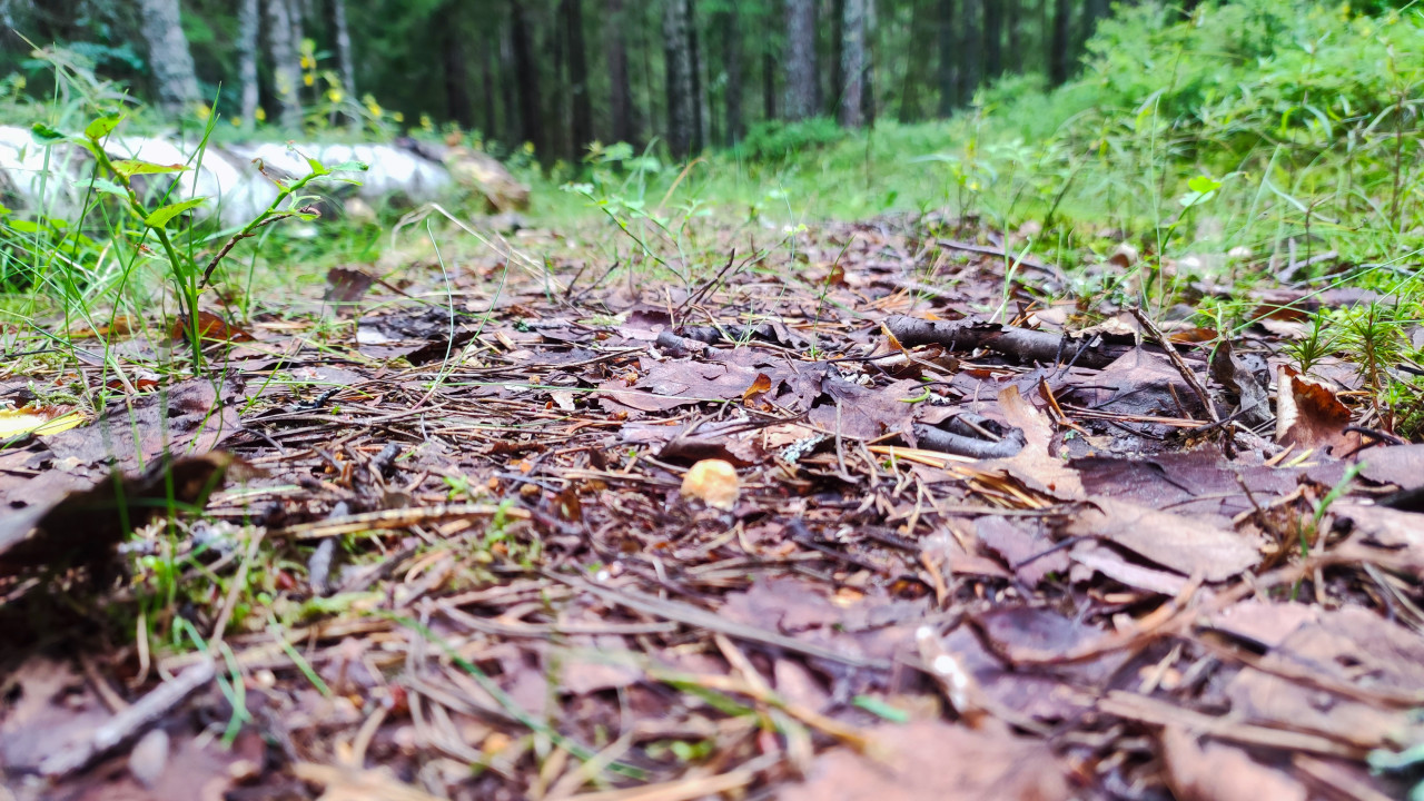На снимке крупным планом показан лесной участок земли, покрытый хвоей, веточками и опавшими листьями. Съёмка выполнена с очень низкой точки, что создаёт ощущение присутствия на уровне земли. На переднем плане выделяются зелёные травинки и небольшие ростки, пробивающиеся сквозь опавший слой. На заднем плане размыто виднеются стволы деревьев и густая растительность, характерные для северного хвойного или смешанного леса. Фотография передаёт детали природной среды и может быть использована в материалах о дикой природе, экологии, лесных экосистемах, а также в иллюстрациях к статьям о ботанике и туризме.