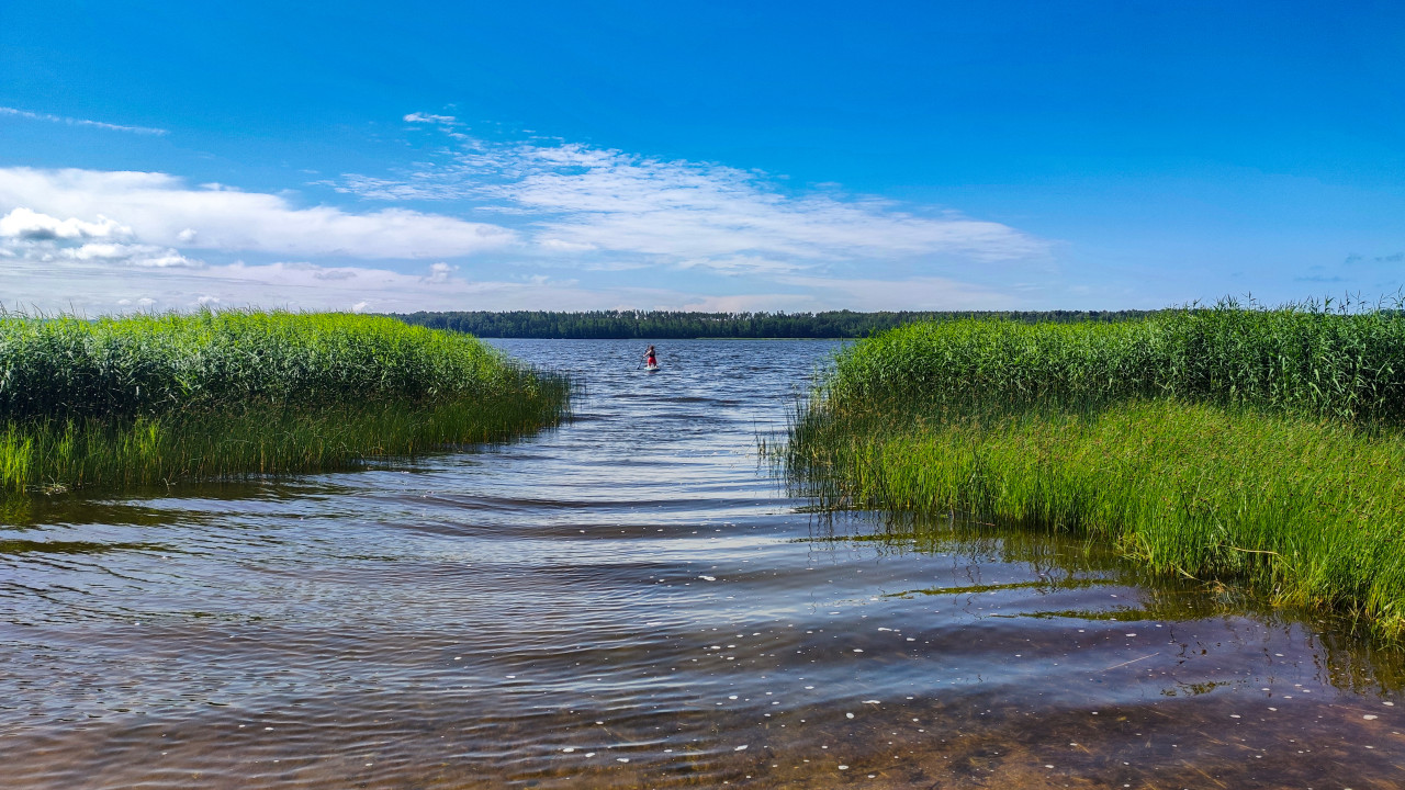 На фотографии изображено озеро, берега которого заросли камышами, а в центре вдали человек плывёт на сапборде. На горизонте видна лесная полоса, а сверху раскинулось голубое небо с облаками. Вода спокойная, отражает свет и зелень растений. Кадр может использоваться для тем, связанных с туризмом, активным отдыхом, водными видами спорта и экотуризмом.